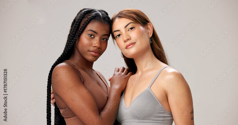 Portrait, skincare and women in studio, beauty and wellness on gray background. Dermatology, support and people with healthy skin, texture and aesthetic with treatment, grooming and cosmetics