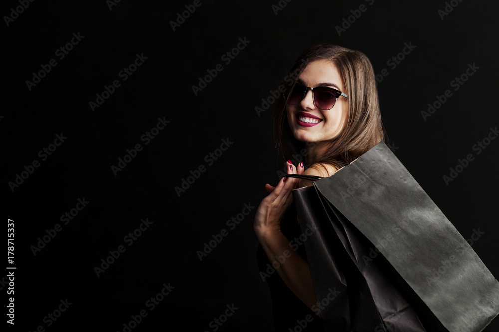 Elegant brunette woman wears sunglasses and black dress holding black shopping bags, black friday concept