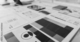App development, wireframe documents and design illustration for site features, UI and template. Paperwork, blueprint and smartphone layout in office for mobile software, UX mapping and graphic model