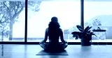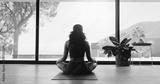 Woman, back view and meditation with zen for inner peace, yoga or spiritual wellness in studio. Calm, female person or yogi with chakra, mudra or mantra for balance or mindfulness in serene dojo