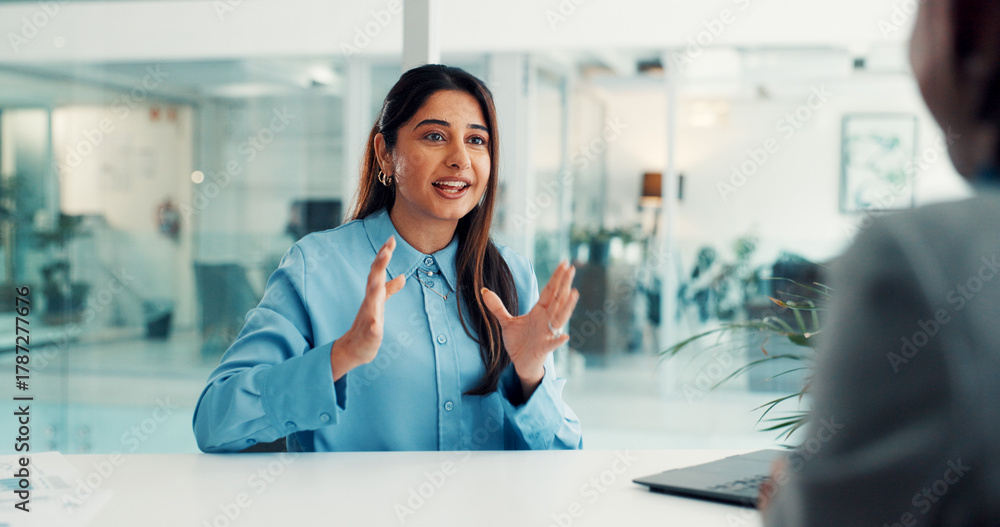 Interview, business woman and discussion in office for hiring process, salary negotiation and questions. Happy, candidate and HR manager with FAQ for performance review, job opportunity or onboarding
