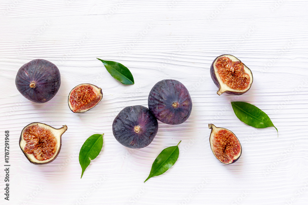Purple ripe figs fruit and slices with green leaves top view on a wooden background