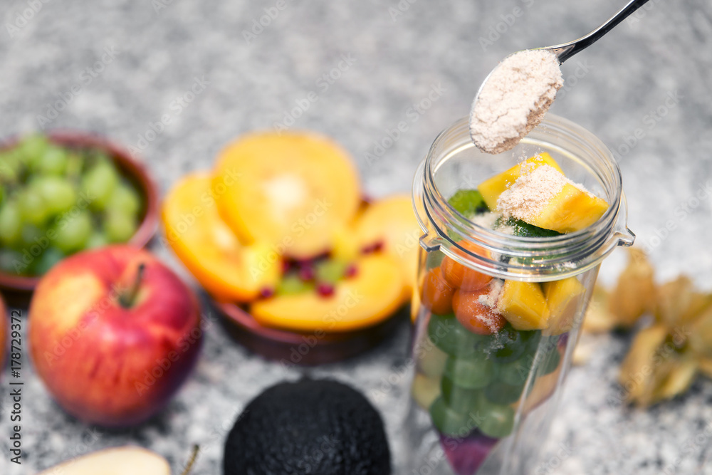 Frisches Obst in einem Smoothiemaker, Superfood Erdmandeln auf einem Löffel