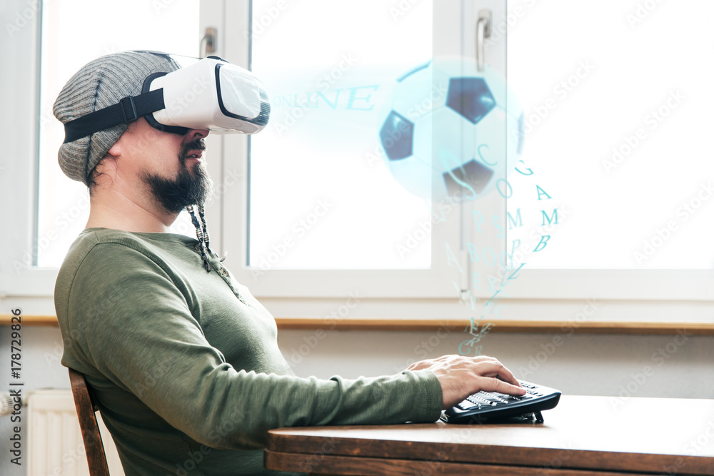 Mann sitzt an Tastatur mit virtual reality Brille, Fussball und Sport als Cyber Hologramm