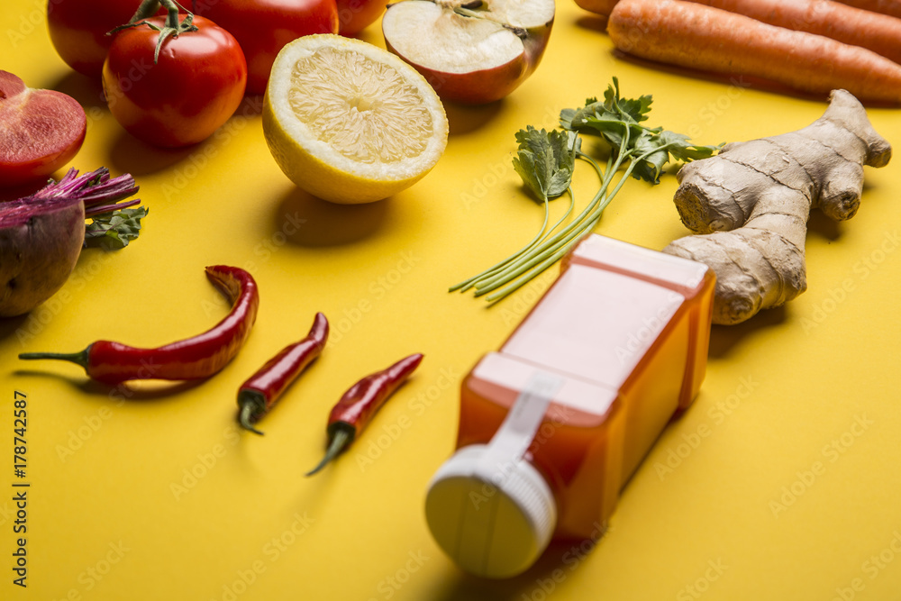 Close up carrot juice in plastic bottle and fresh vegetables on yellow background. organic detox juice.