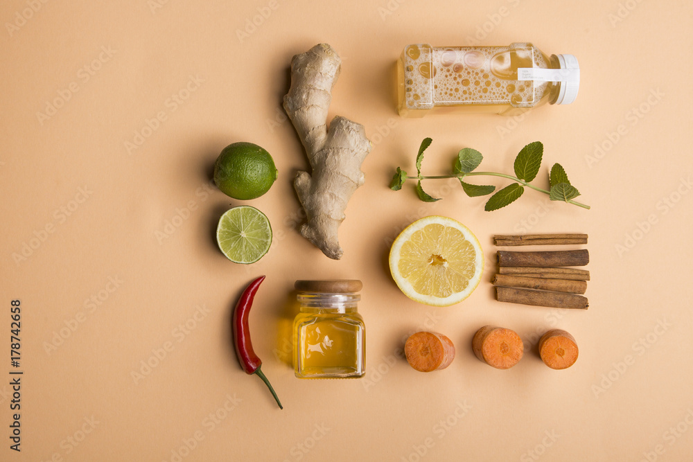 Organic detox juice with ginger, mint, lemon and lime ingredients on soft orange background. Tabl top view. Flat lay. Healthy frsh products