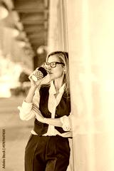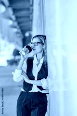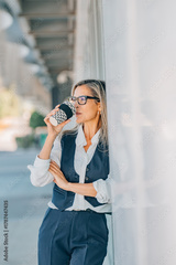 adult businesswoman with glasses drinking coffee during a work break, vertical