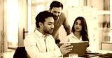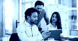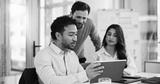 Meeting, tablet and business people in office for financial review, discussion or budget planning. Teamwork, corporate and workers on digital tech for research, website or proposal for finance report