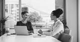 Laptop, discussion and business women in office with feedback on corporate performance review. Meeting, computer and female hr manager with employee for advice on career evaluation in workplace.