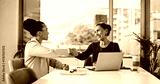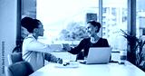 Handshake, meeting and business women for partnership, deal or thank you in office. B2B merger, laptop or shaking hands for welcome, congratulations or client introduction for collaboration agreement