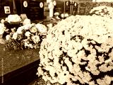 Colorful chrysanthemums flowers on graveyard in front of a tombstone during all saints day and all souls day, to commemorate loved ones that passed away. Flowers on cemetery. All saints day graveyard.