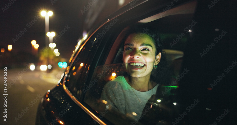 Happy, tablet and businesswoman in car at night in city with networking, email or communication. Smile, technology and female person checking project with deadline in vehicle with commute in town.