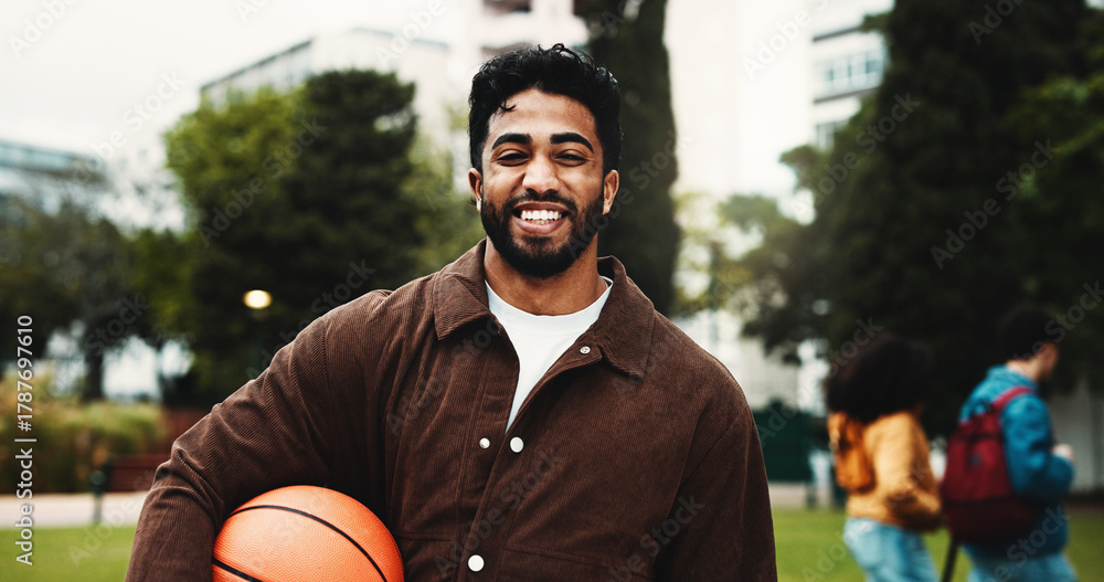 Portrait, student and happy man with basketball at college, sports scholarship and education. Smile, university and person with ball at campus outdoor for learning, development and athlete bursary