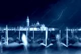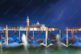 San Giorgio Maggiore church and gondolas in Venice, Italy during blue hour with dramatic sky and lighting. Focus on the church.