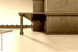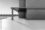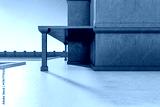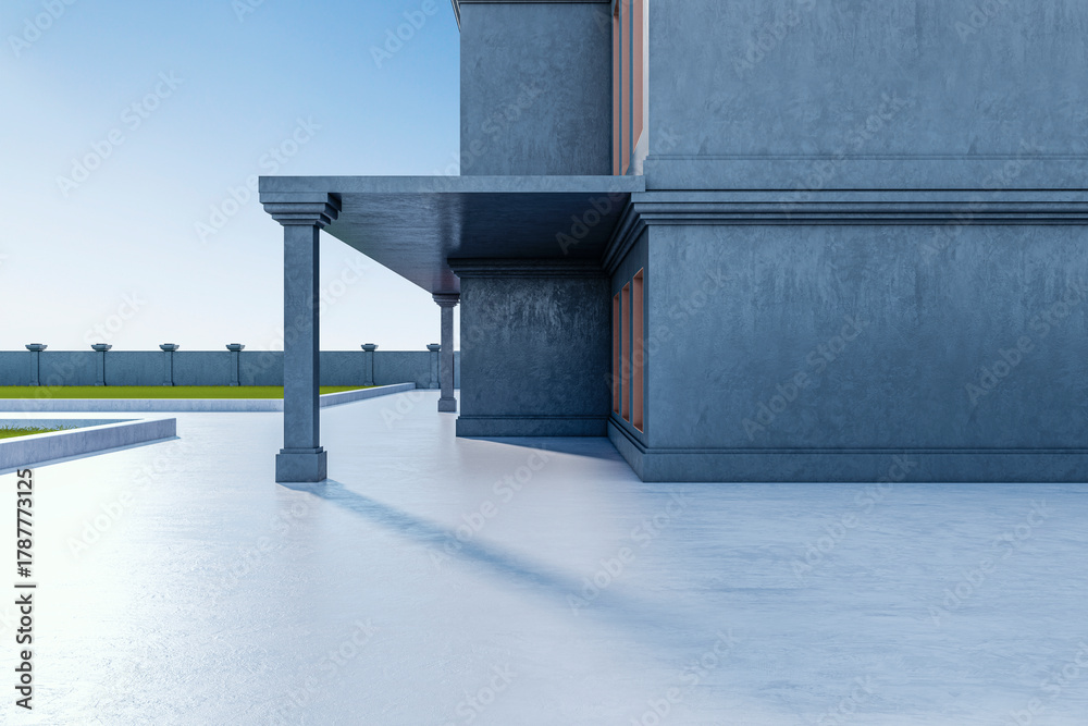 Modern empty building exterior with minimalist blue facade in bright light under clear sky outdoors concept design background. 3D Rendering