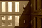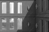 Modern building facade with large windows reflecting skyscrapers and geometric lights casting shadow patterns on a minimalist wall surface. 3D Rendering
