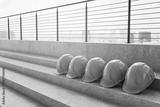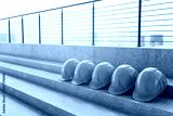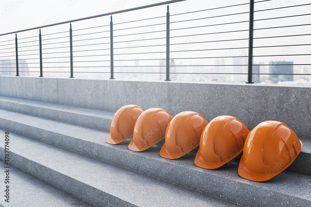 Five orange construction helmets on concrete steps with city skyline in soft background and bright lighting concept of teamwork and safety. 3D Rendering