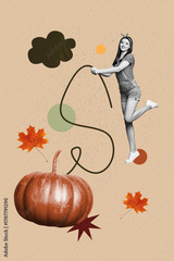 Banner image zine art pop trend collage of happy girl hold rope pumpkin celebration thanksgiving occasion leaves maple autumn