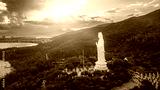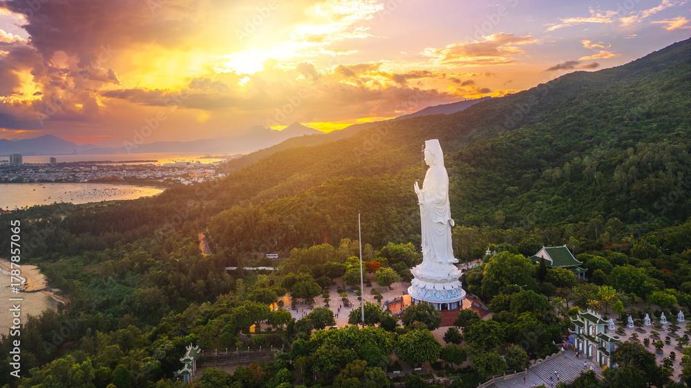 Aerial Panorama Of Lady Buddha Statue Overlooking Da Nang Bay At Sunset