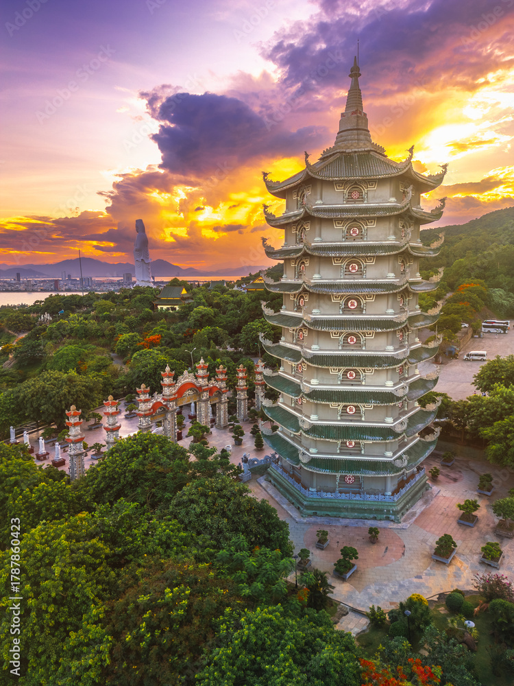 Sunset Over Linh Ung Pagoda Tower With Scenic Coastal View In Da Nang Vietnam