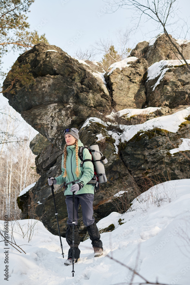 Caucasian young adult woman hiking through snowy forest trail carrying backpack and trekking poles, standing near large rock formation with snow covered ground and trees in background