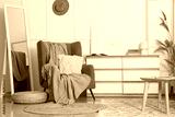 Stylish interior of living room with comfortable armchair and chest of drawers near white wall