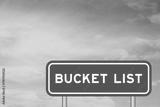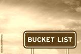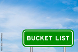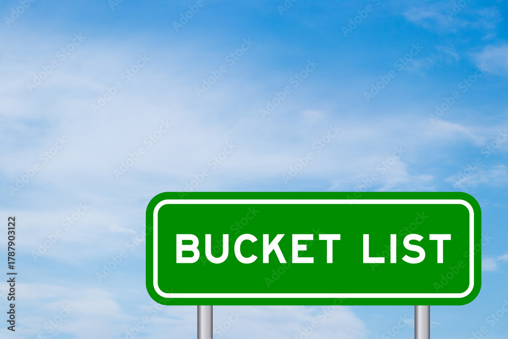 Green color transportation sign with word bucket list on blue sky with white cloud background