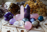 Rose quartz and amethyst obelisks and dried herbs on a magical wooden altar. Fortune telling, witchcraft, and esoteric spiritual practice.