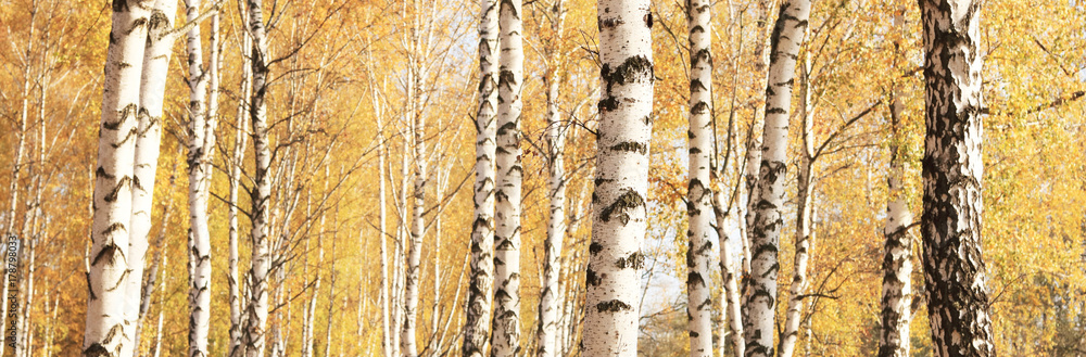 beautiful autumn panorama with yellow birches in birch grove