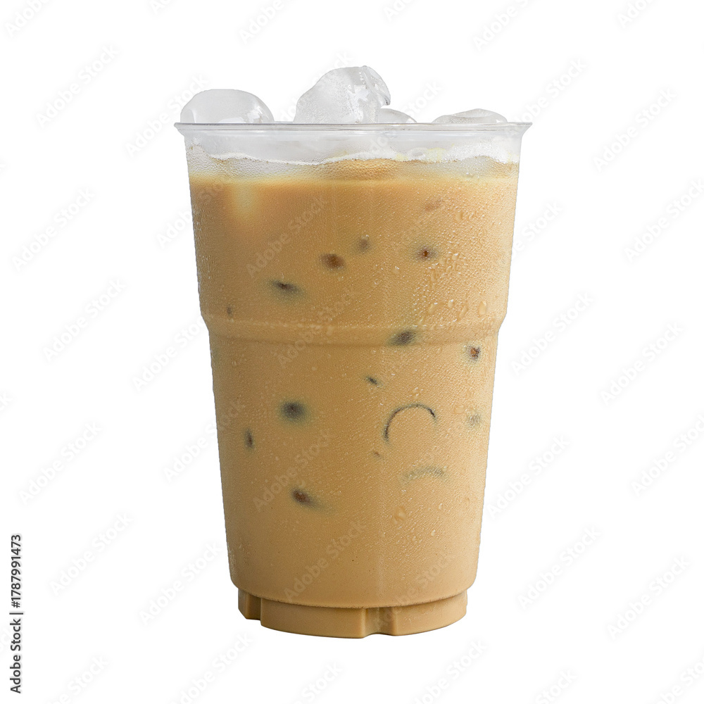 Iced coffee on plastic glass and tube sucking isolated white background, summer drink concept
