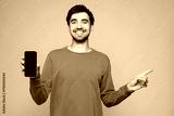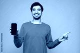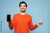Young man wear orange sweatshirt casual clothes hold in hand use mobile cell phone with blank screen workspace area point aside isolated on plain pastel light blue cyan background. Lifestyle concept.