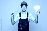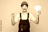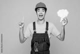 Young employee laborer handyman man wears helmet overall say cloud with lightbulb point finger up isolated on plain yellow background. Instruments for renovation apartment room. Repair home concept.