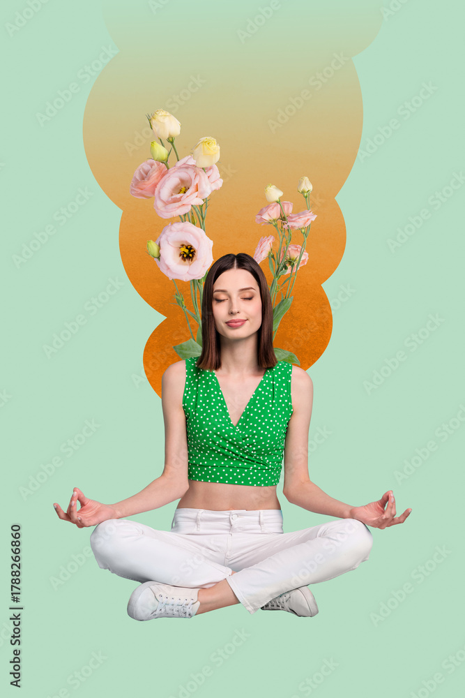 3d poster image vertical pop art collage of happy girl guy sit yoga pose spring leaves flower bloom ethereal florist holiday