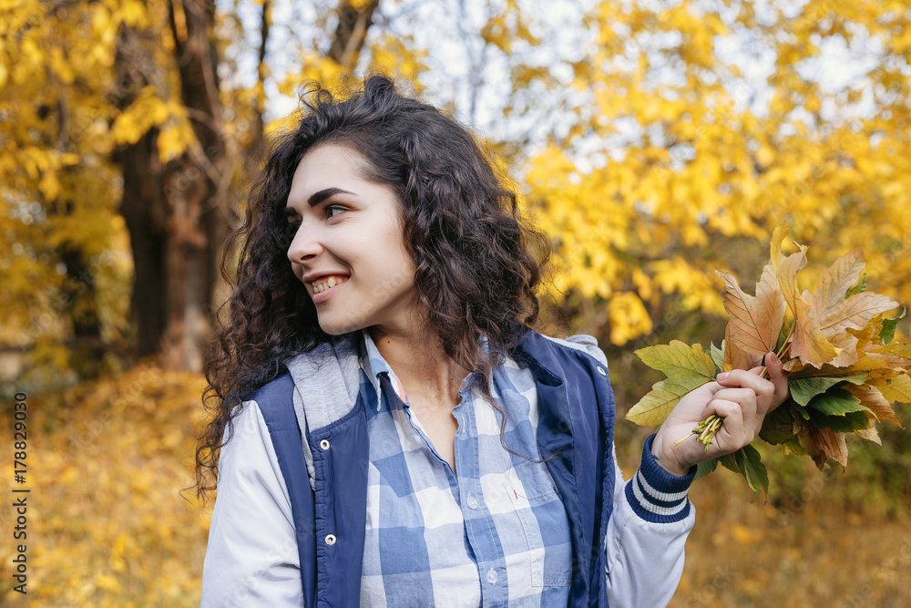 Pretty girl holding in hands bunch of leaves. Young woman looking sideways and smile. Outdoor. Close up. Autumn.