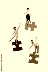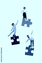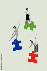 Image poster pop banner collage of happy business partners girls guys stand puzzle jigsaw match team building progress chance