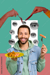 Zine pop vertical photo collage of happy girl guy stand eyeball stare control hands exploitation puppet look fork knife brainwash