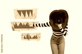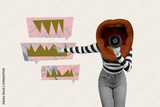 Sketch template design collage of mouth headwoman body talk megaphone finger point speech cloud crime fear victim harassment pressure