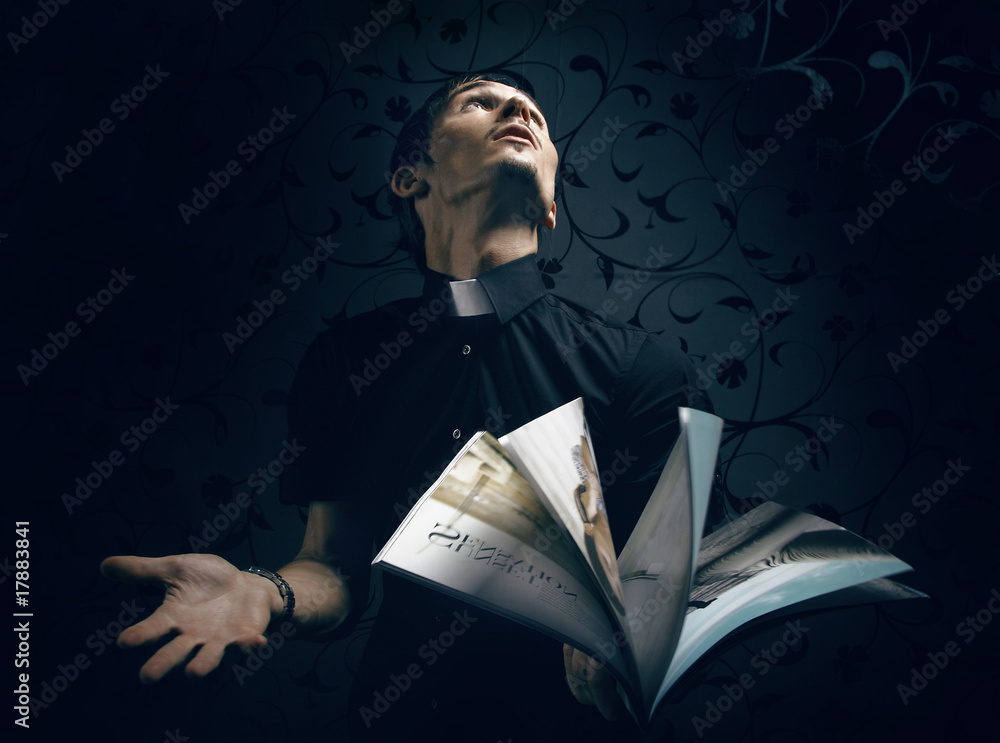 Young priest surprised of read in fashionable magazine. Photo.