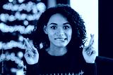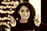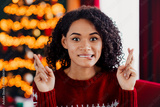 Playful festive portrait of a smiling woman in a red sweater crossing fingers beside a warmly lit Christmas tree capturing cozy home holiday cheer and hopeful vibes
