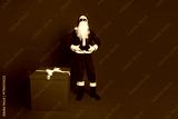 Santa in red costume with beard and hat stands beside a gift box against a bold red background for a cheerful Christmas scene