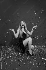 Joyful woman in a sparkling black dress celebrates a festive party surrounded by confetti on a bold red studio backdrop