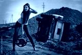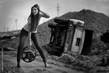 The girl with wheel in a hand against broken car. Photo.