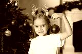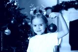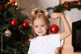 Little girl with ornament near Christmas tree at home