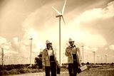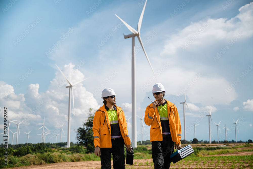 Professional Maintenance Crew Field Inspection Wind Mill Background, Walking Wind Turbine Maintenance Green Power Project. Future Electricity Grid Field Work. Renewable Power Generation Site