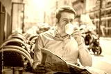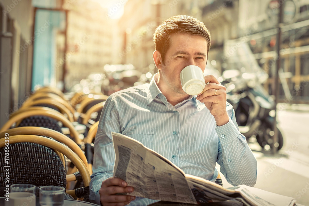 Businessman with newspaper sitting outdoor in restaurant under s