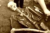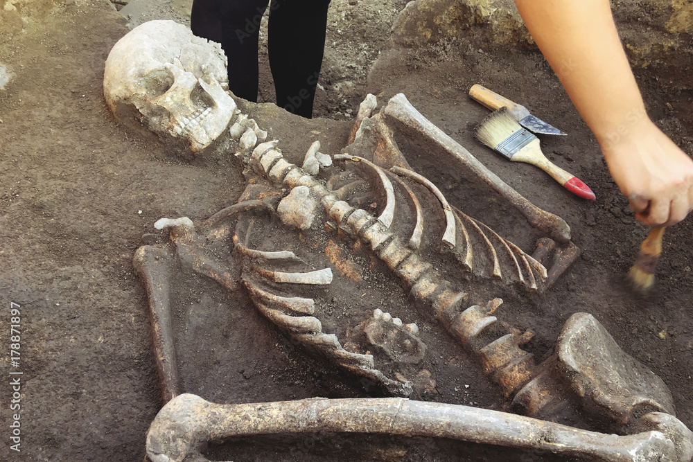 Archaeological excavations. archaeologist with tools conducts research on human burial, skeleton, skull.