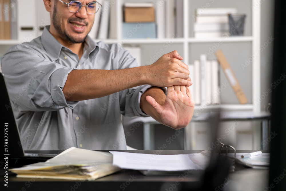 Businessman suffering from wrist pain while working on computer, Businessman massaging his hand and wrist after long hours in front of a computer