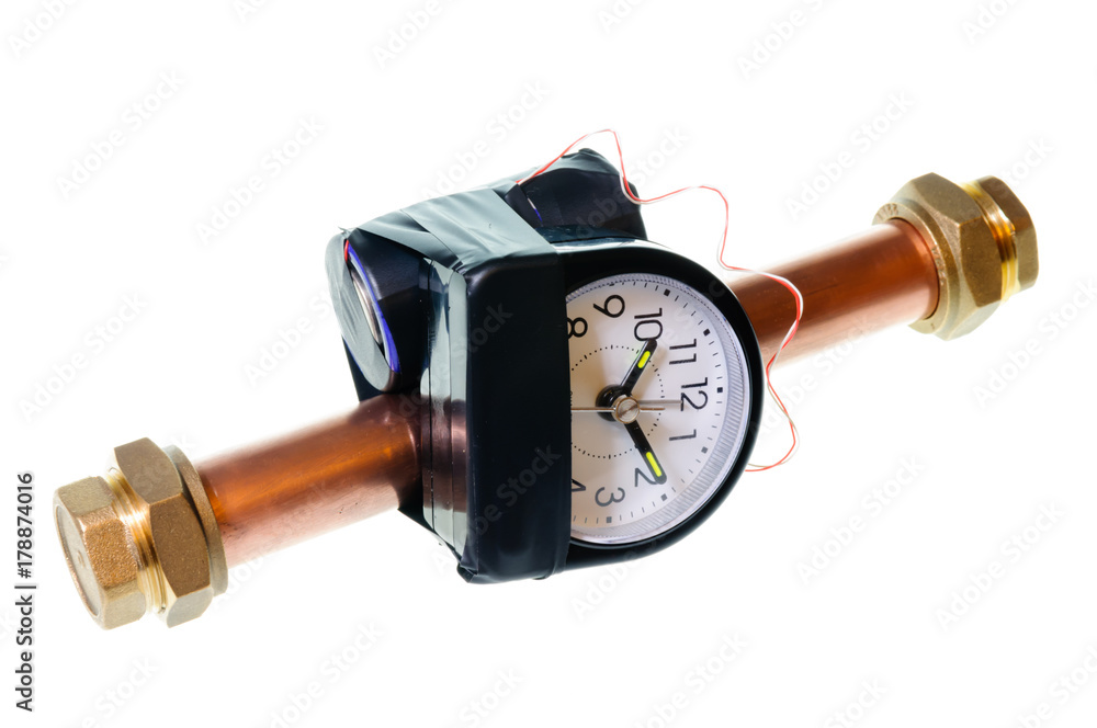 Pipebomb made from copper tubing, with a battery and alarm clock detonator