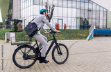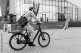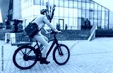 Young businessman riding an electric bike to work, wearing a professional suit.