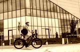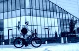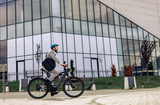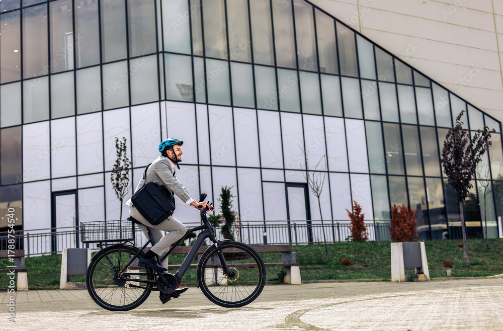 Young businessman riding an electric bike to work, wearing a professional suit.